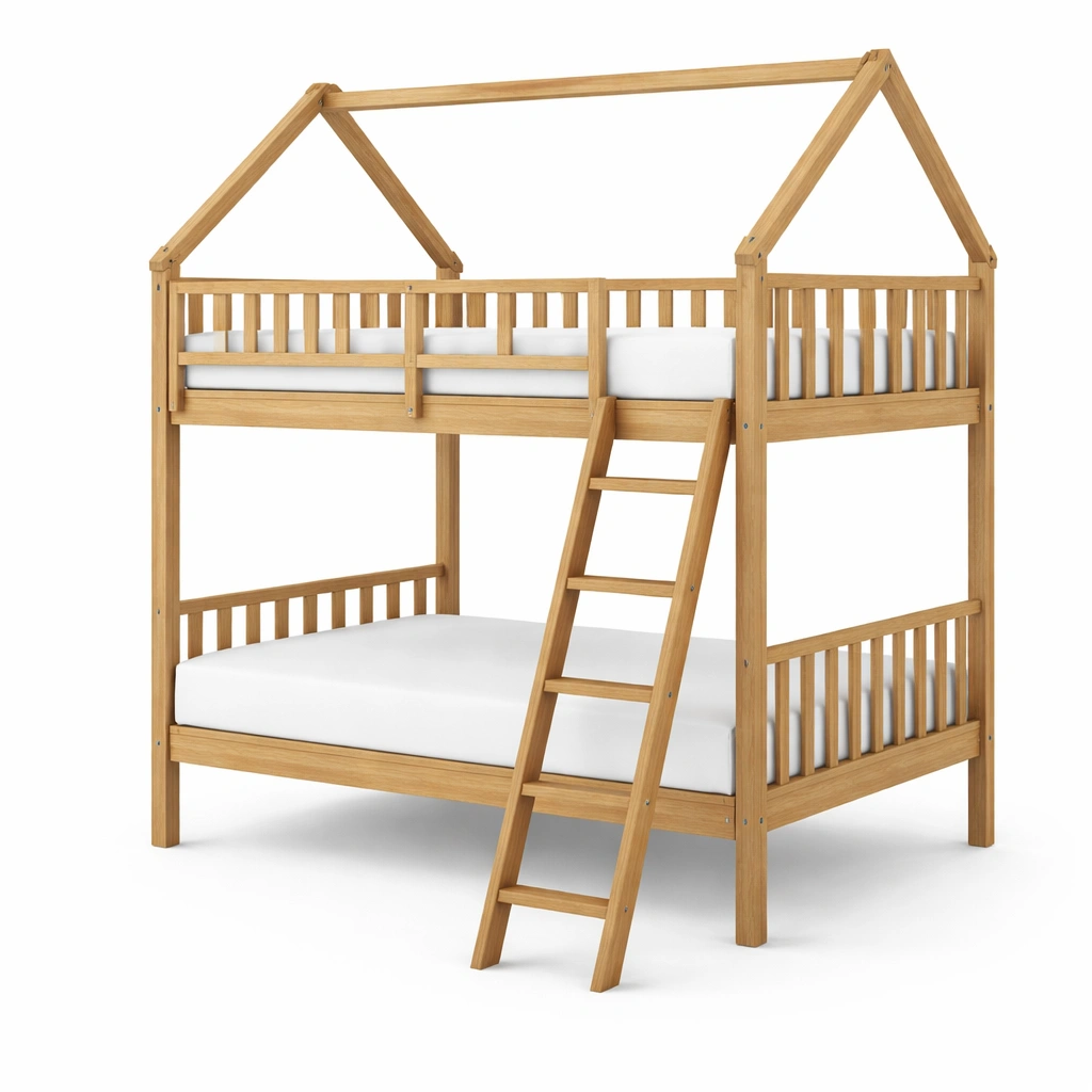 Litera de madera de pino con diseño de casa