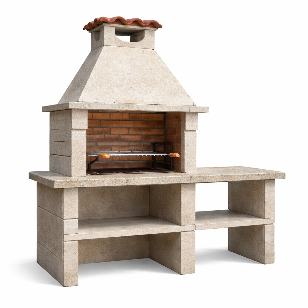 Material principal: Hormigón reforzado con ladrillos refractarios en la zona de combustión. Teja cerámica utilizada en el techo para protección.