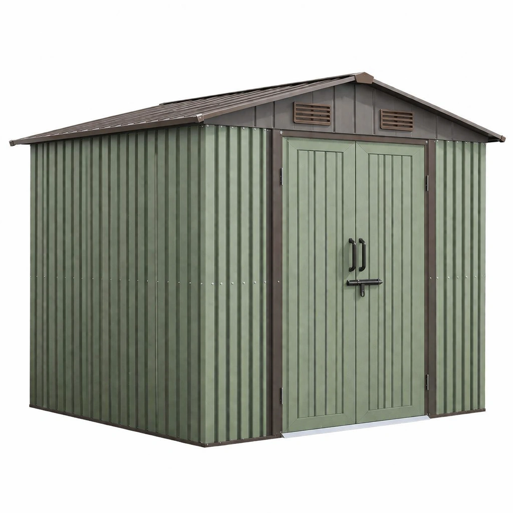 El cobertizo está fabricado con acero galvanizado, revestido con pintura en polvo. Sus dimensiones son 213 cm de largo, 127 cm de ancho y 185 cm de alto. Su peso neto es de 50 kg. Presenta un diseño con paneles acanalados verticales.