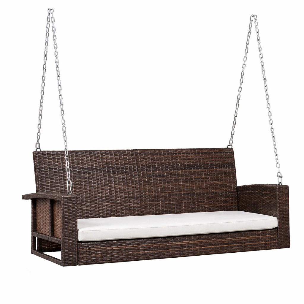 Material: Estructura de ratán sintético, cojín de poliéster, cadenas de acero galvanizado.